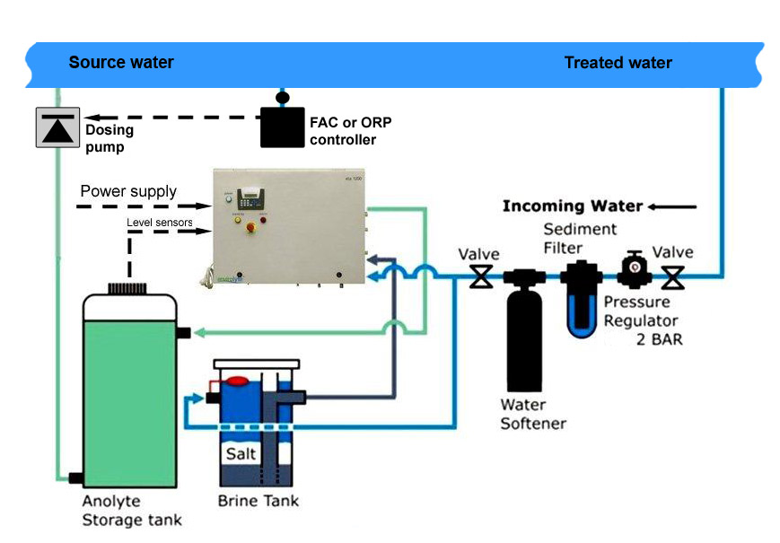 Bei einer typischen Funktionsweise eines Envirolyte-Geräts wird das Anolyt in einem Behälter gesammelt und dann dosiert in das durchfließende Wasser abgegeben. Die Dosierung hängt von der Einstellung bezüglich der Wassermenge und der Qualität (Eigenschaften) des Wassers ab und wird durch einen Durchflussmesser verbunden mit einer Dosierpumpe gesteuert.